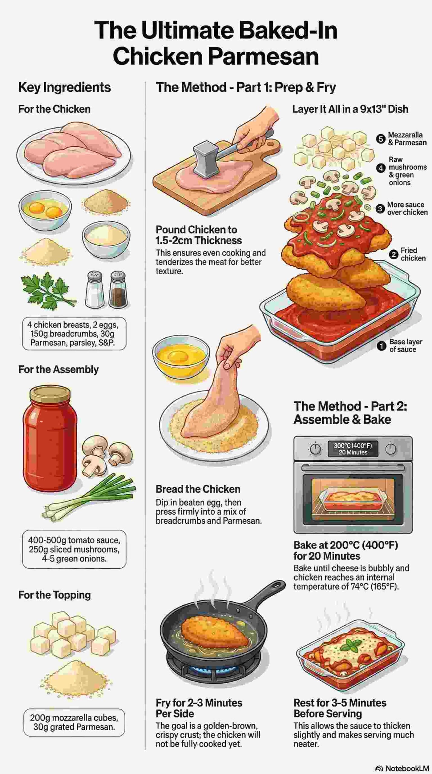 Traditional chicken Parmesan requires pan-frying chicken until fully cooked, then assembling with sauce and cheese before a brief bake to melt the topping. This baked-in variation reduces active cooking time by finishing the chicken in the oven while simultaneously cooking mushrooms and green onions from their raw state. The extended oven time allows flavors to meld while the chicken’s breading maintains its crispy texture under a protective layer of sauce and cheese.