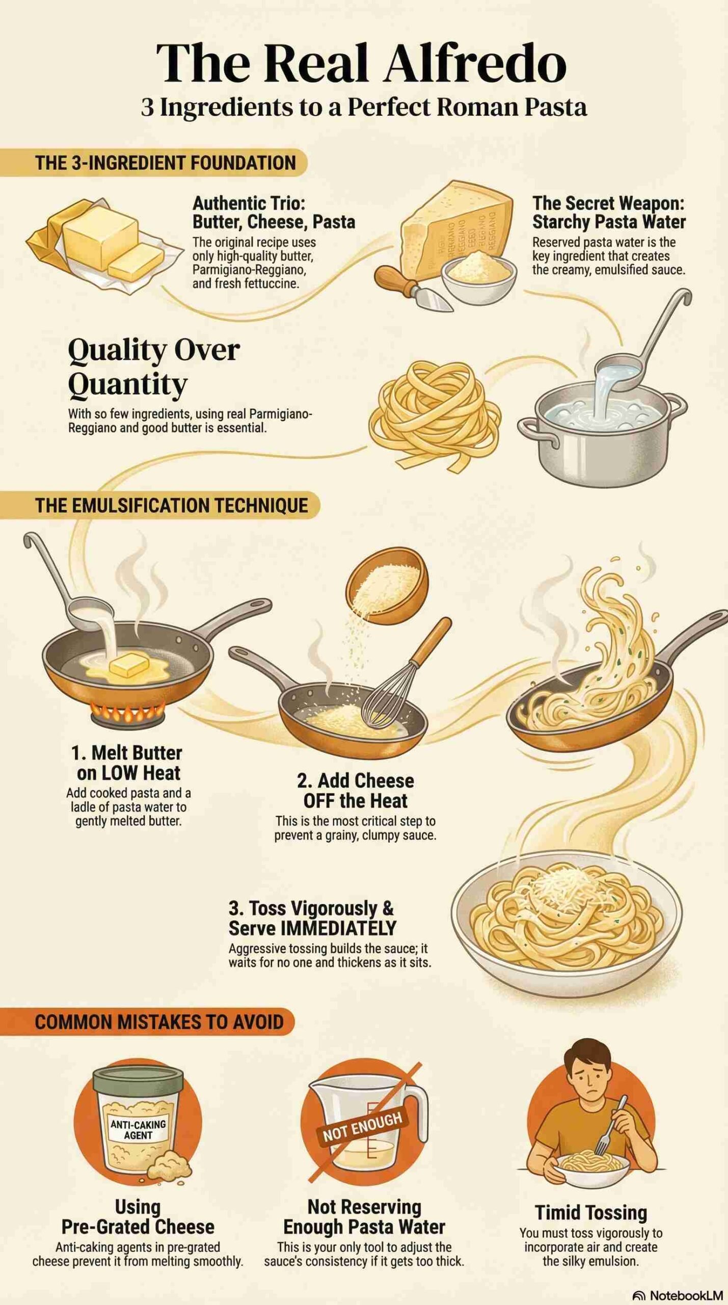 The genius of authentic Alfredo is the emulsion—the stable suspension of fat in water created by vigorous mixing. Pasta water contains starch that acts as an emulsifier, binding the butter and water together. The Parmigiano adds protein and more fat, further stabilizing and enriching the emulsion.