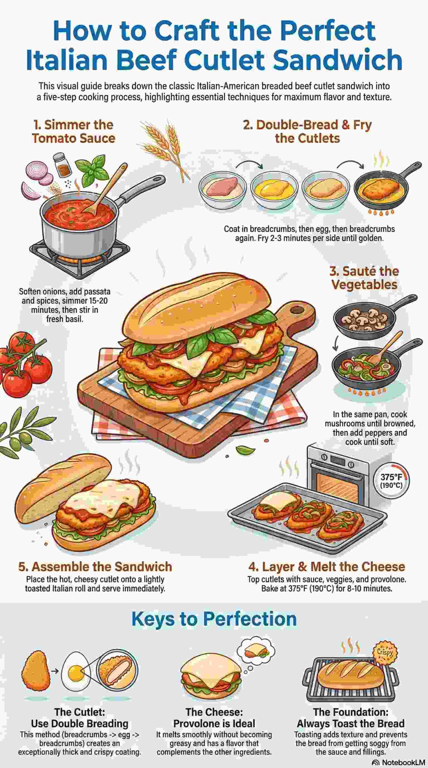 There’s something deeply satisfying about a well-made cutlet sandwich. Crispy, golden breading meets tender meat, melted cheese, bright tomato sauce, and savory sautéed vegetables, all stacked into one hearty bite. This Italian-style breaded beef cutlet sandwich draws from classic Italian-American cooking, where breaded cutlets are the base for countless comforting meals.