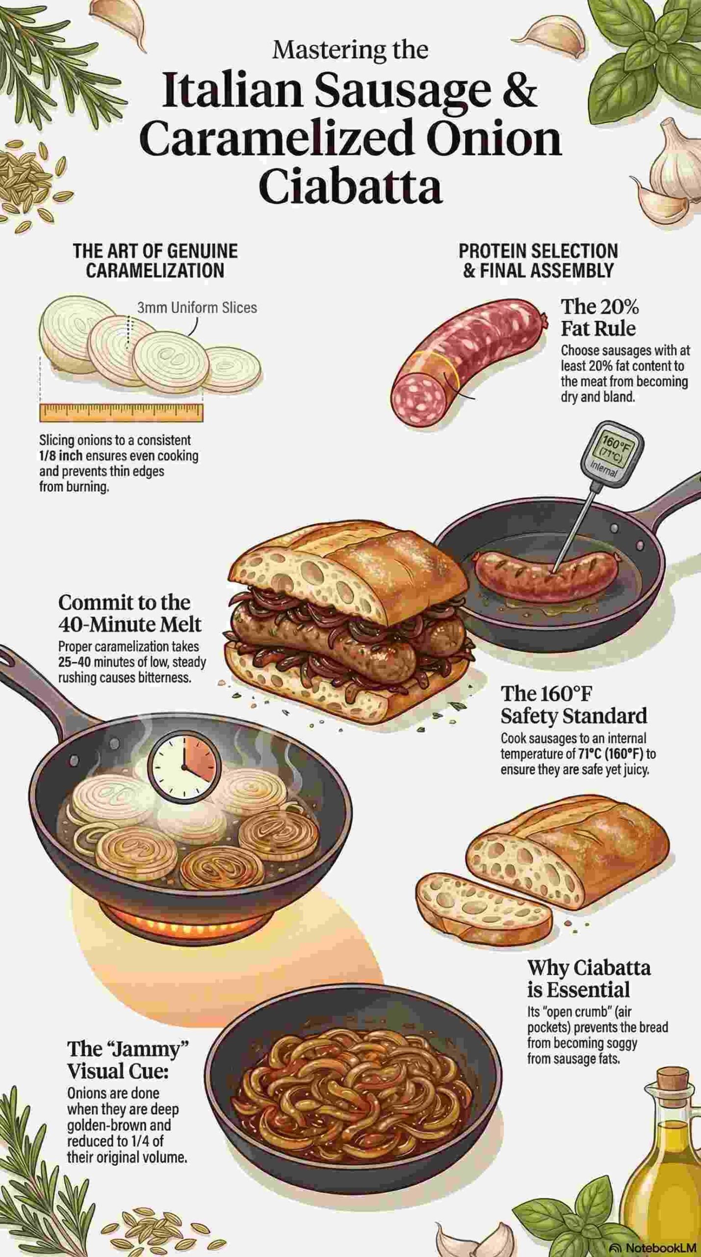 This Italian fennel sausage ciabatta transforms simple ingredients into something deeply satisfying through patient technique: fennel-scented sausages paired with sweet, jammy caramelized onions, all piled into crispy-crusted bread. The dish exemplifies how proper execution of fundamental techniques elevates everyday components.