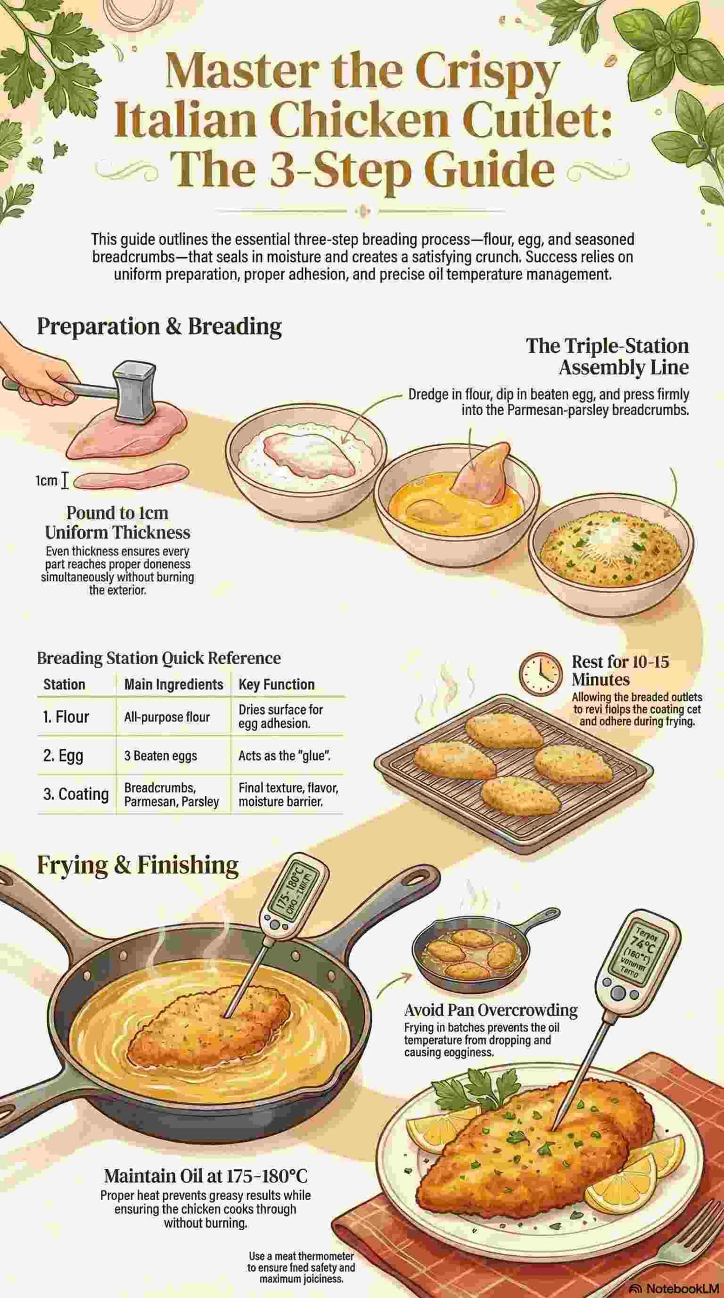 Thin, even cutlets cook quickly and uniformly, preventing the common problem of burnt coating with raw interior. Pounding chicken breasts to uniform thickness ensures every part reaches proper doneness simultaneously. The technique appears throughout Italian cuisine in preparations like cotoletta alla milanese (Milanese-style cutlet) and pollo alla parmigiana (chicken Parmesan, which uses these cutlets as its base).