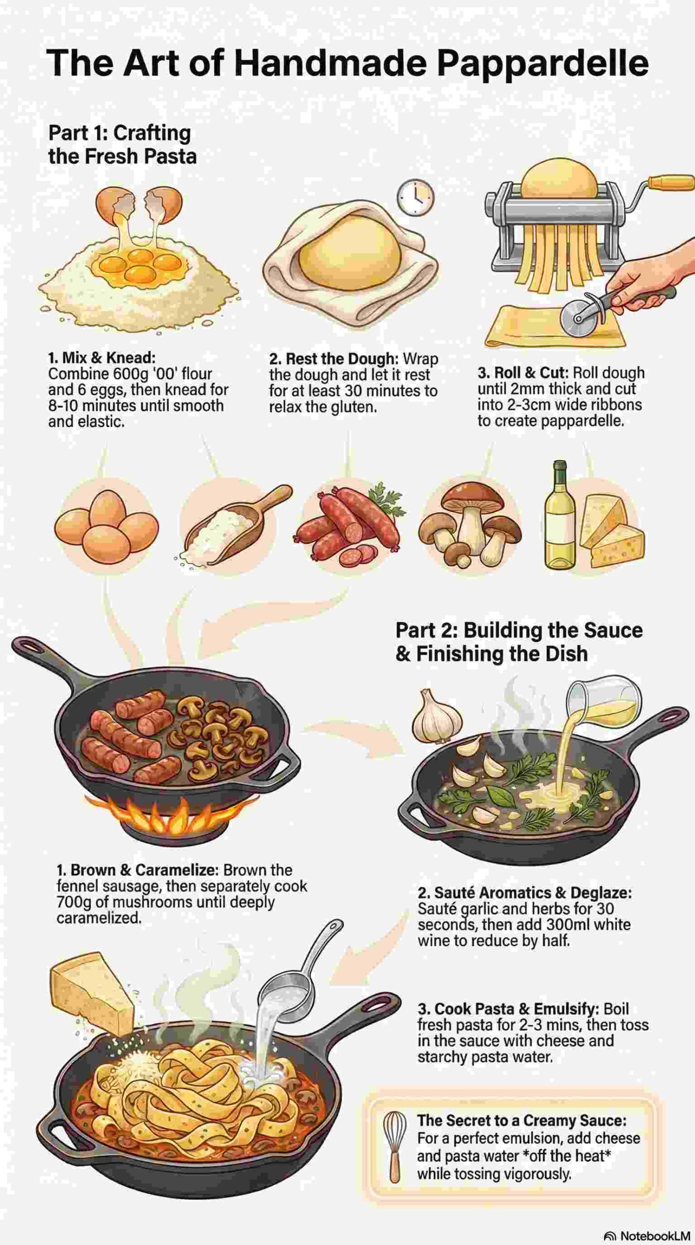 This fresh pappardelle recipe demonstrates fundamental techniques of Italian pasta cookery: handmade pasta construction, proper meat and vegetable caramelization, effective deglazing, and the crucial emulsification that transforms simple ingredients into a cohesive, restaurant-quality dish. Mastering these methods provides a foundation for countless pasta preparations, each showcasing the superior qualities of fresh, handmade pasta.