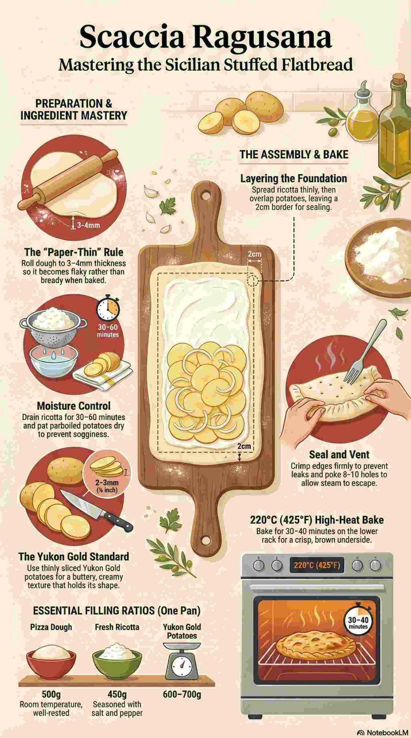 Control moisture: Excess moisture in the ricotta or from undrained parboiled potatoes creates soggy scaccia. Drain ricotta if very wet, and dry parboiled potatoes thoroughly before assembly.