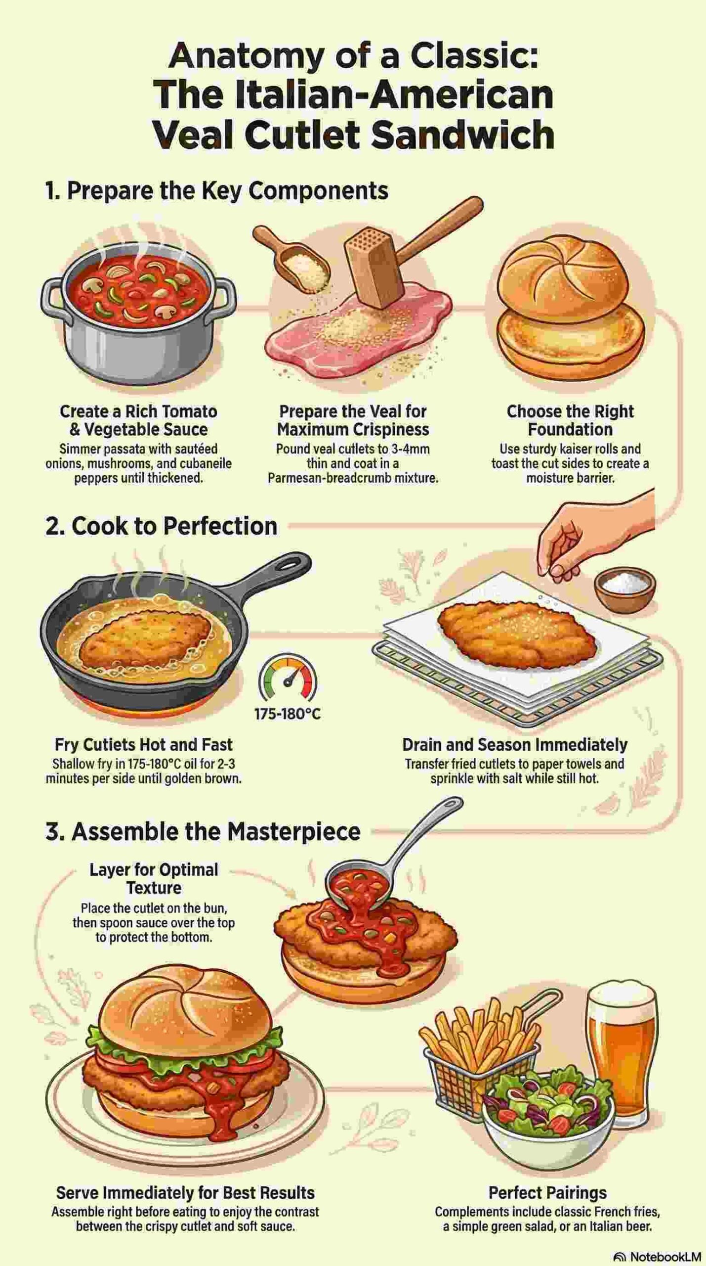 Cheese additions: Some variations include melted provolone or mozzarella placed on the cutlet before adding sauce, creating a more “veal Parmesan” style sandwich. To incorporate cheese, place a slice on each cutlet immediately after frying, allowing residual heat to melt it before assembly.